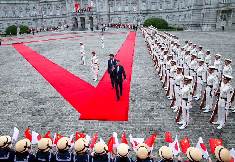 李克强总理当地时间5月9日下午出席日本首相安倍晋三在东京赤坂迎宾馆为他举行的隆重欢迎仪式。两国领导人登上迎宾台,军乐队先后奏响中日两国国歌。百余名日本儿童挥舞着两国国旗欢迎中国总理的到来。随后,李克强在安倍陪同下,沿红地毯检阅仪仗队。