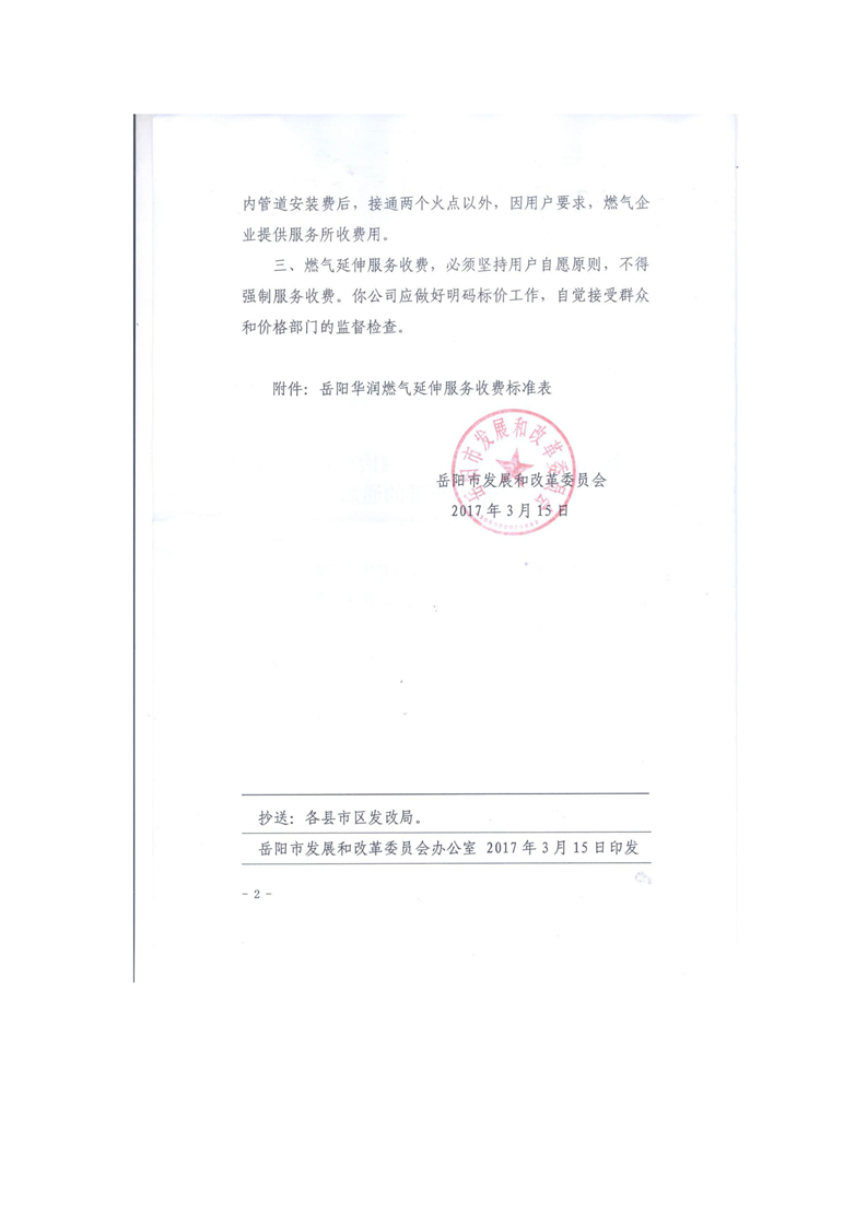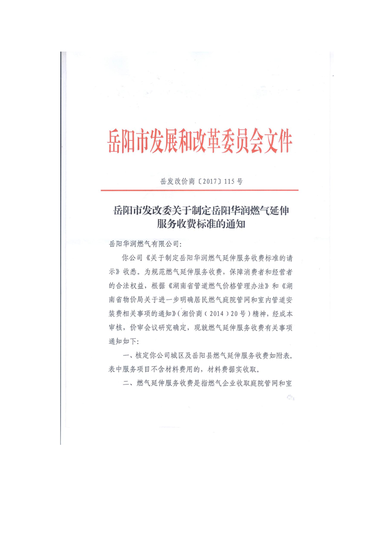 岳阳市发改委关于制定岳阳华润燃气延伸服务收费标准的通知【岳发改价商[2017]115号】