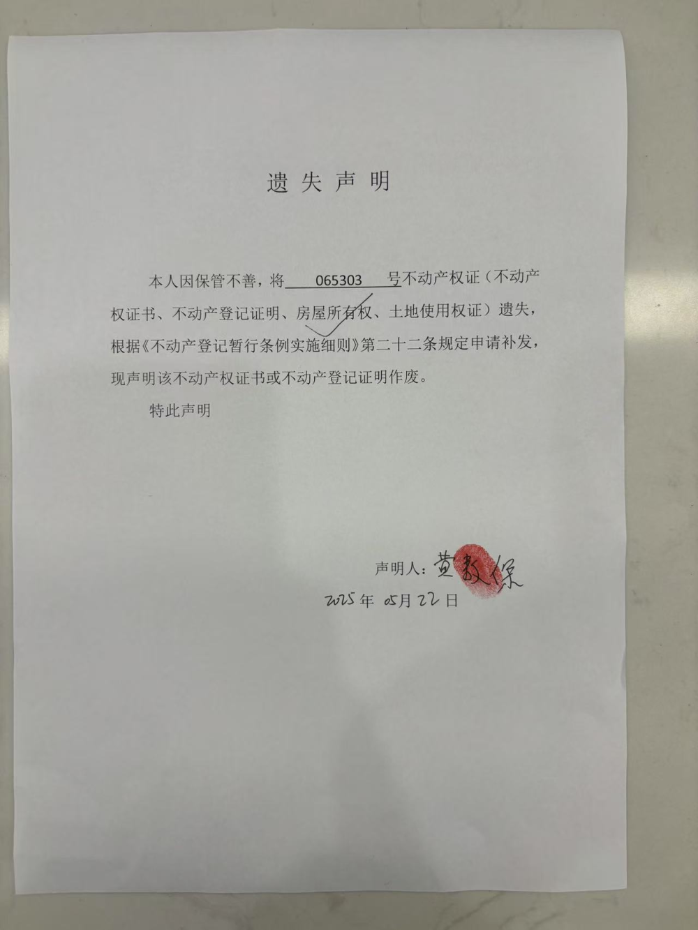 不动产权证遗失声明(黄敖保)