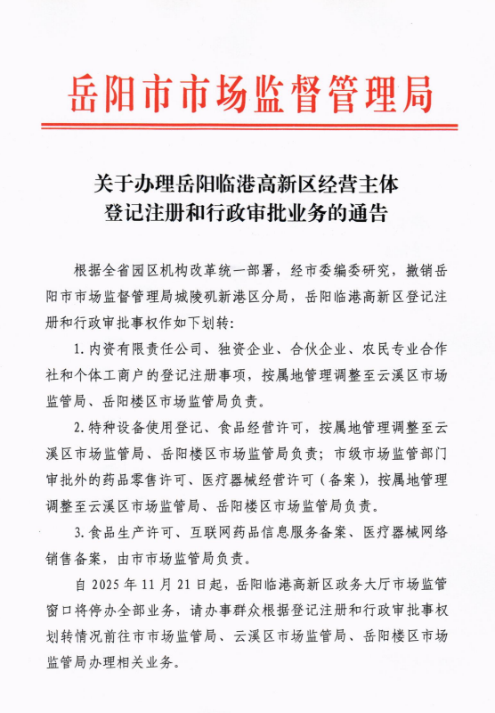 关于办理岳阳临港高新区经营主体登记注册和行政审批业务的通告